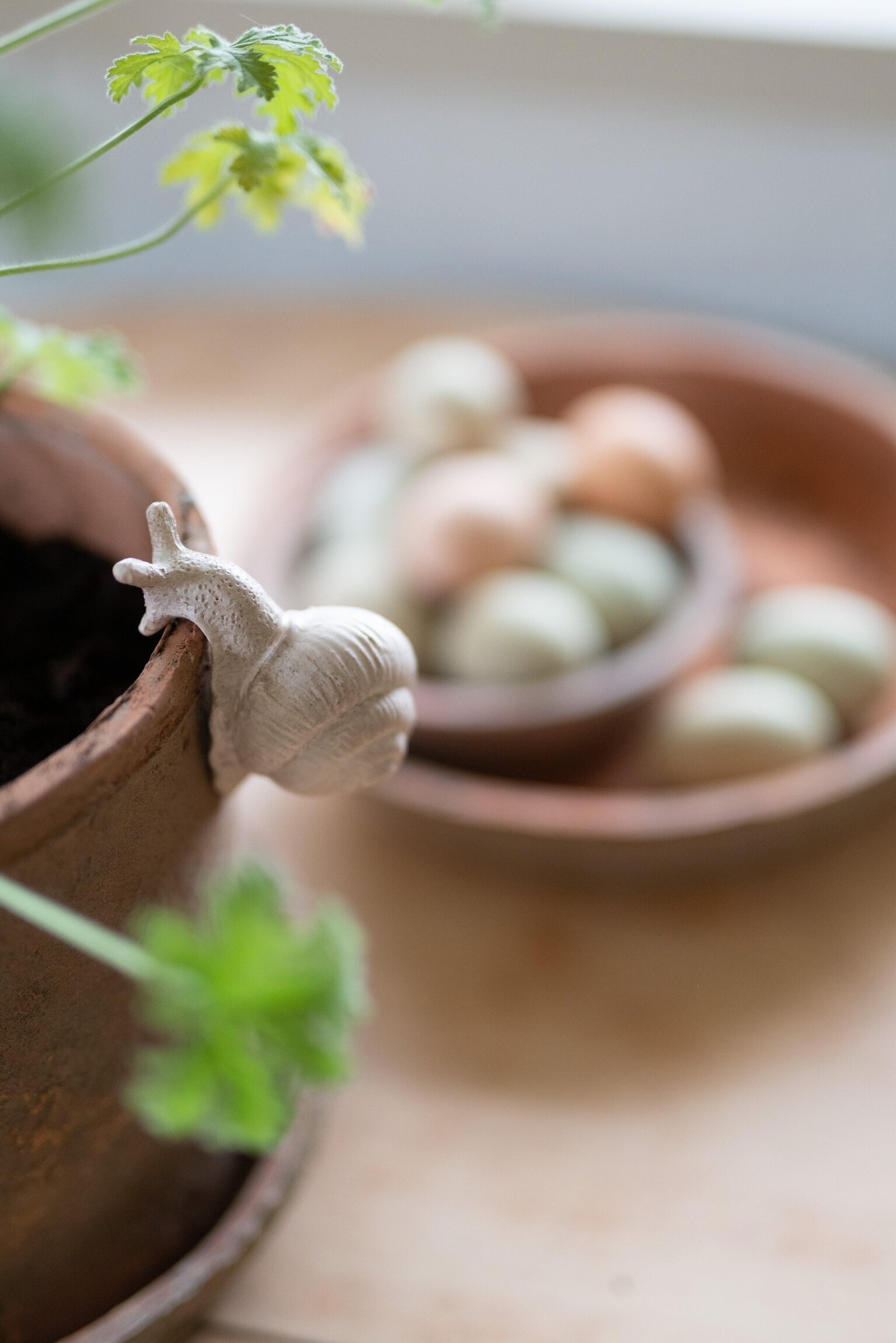 Dekorativa sniglar som antingen kan hängas på kruka eller läggas i kruka i ett blomsterarrangemang. En fin detalj i trädgården.