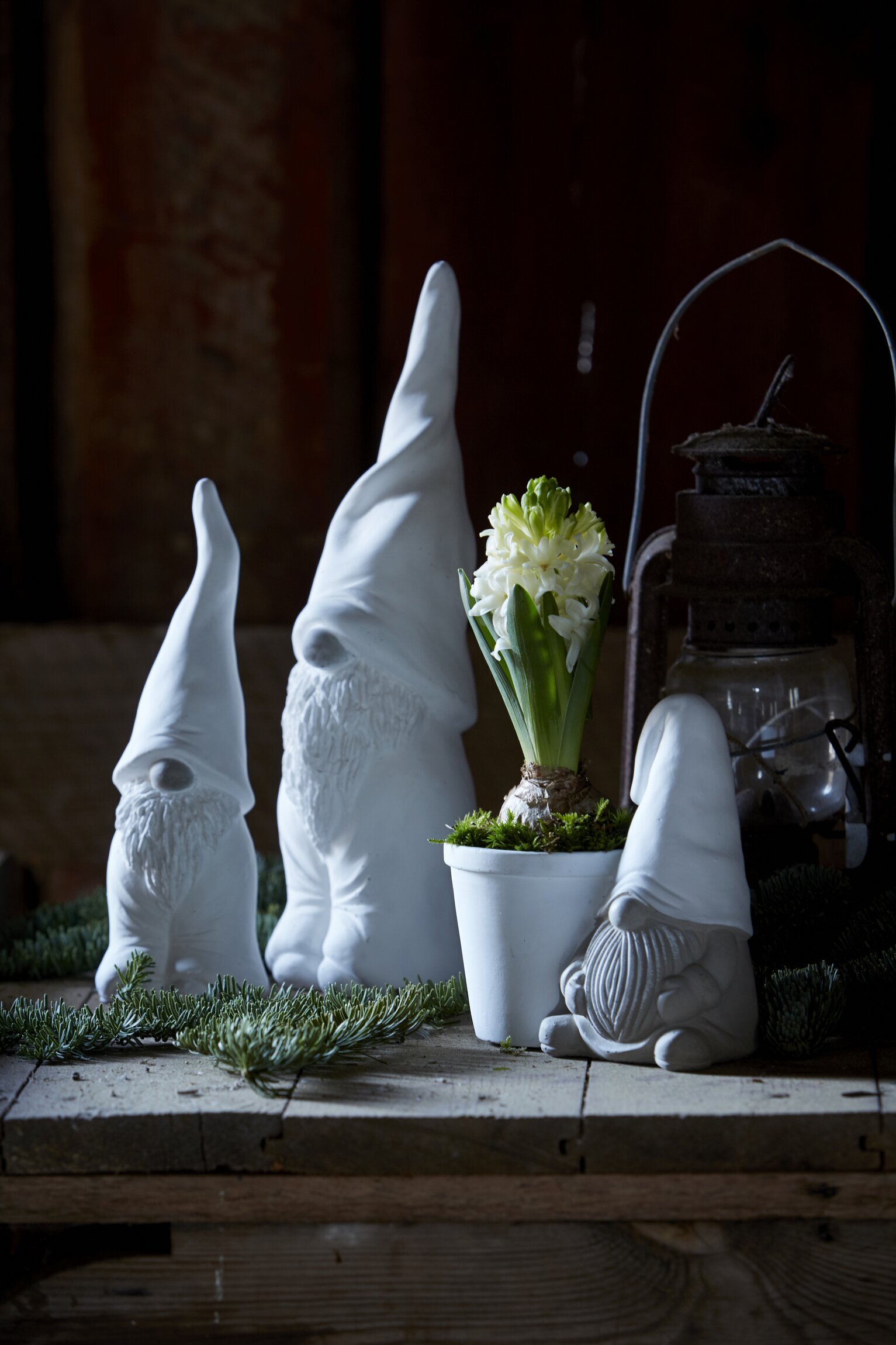 Bilden från Köpstaden.se visar en stämningsfull interiör med ett särskilt fokus på dekorativa figurer från Wikholm Form. I centrum av bilden står tre vita tomtar av modellen Tomte Niklas Vit Mellan, vackert placerade på ett slitet träbord som ger en rustik känsla. De olika tomtarna har en yta i matt vit, vilket bidrar till en harmonisk och rogivande atmosfär.