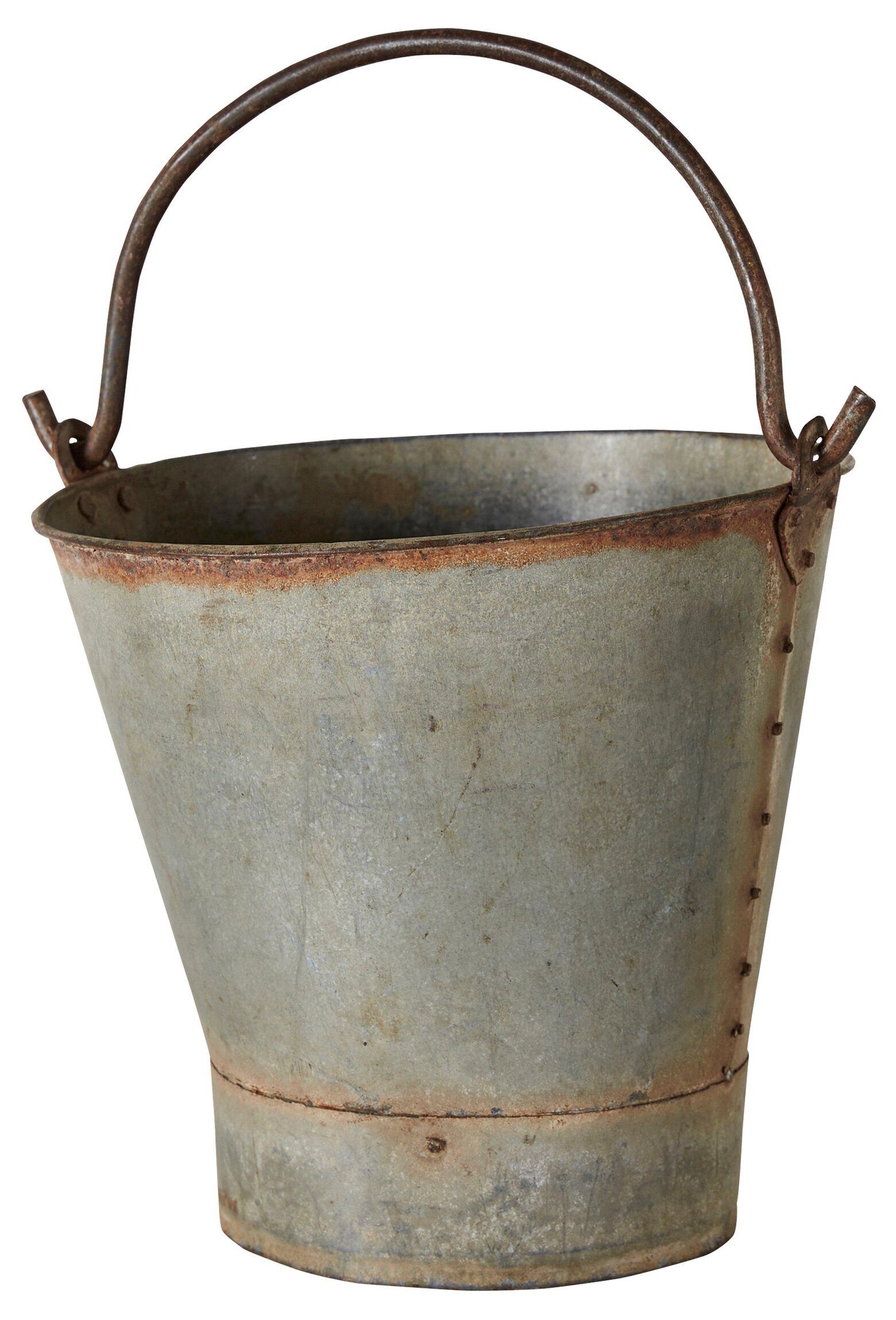 Handtaget är robust och tillverkat av en mörkare metall, som med tiden har fått naturliga rostfläckar. Det är fastsatt med nitar på vardera sidan av hinken, vilket säkerställer att det är både funktionellt och estetiskt tilltalande. Det böjda handtaget gör det enkelt att bära hinken, oavsett om den används för praktiska syften eller som en dekorativ detalj.