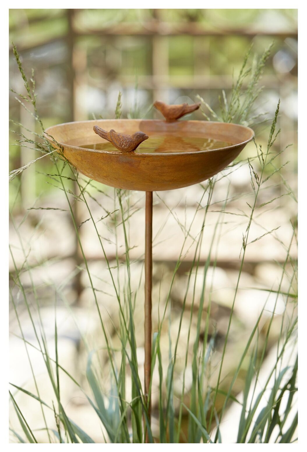 Vackert fågelbad på fot tillverkat i rostig plåt med medföljande stativ, från Wikholm Form.