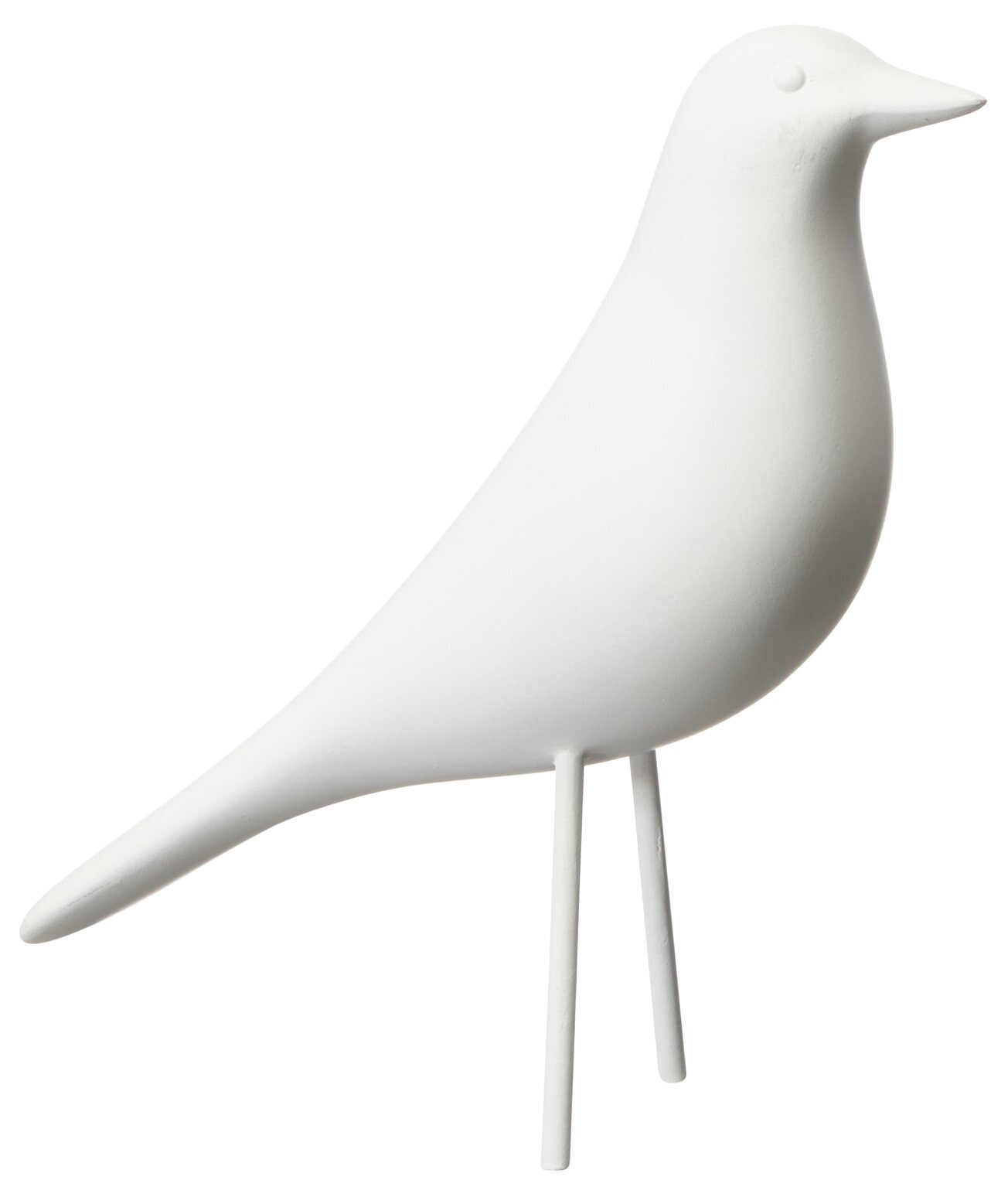 Fågeln har en stilren design med mjuka kurvor och en jämnt vit yta. Kroppen är väl proportionerad, med en rundad bål och en smal svans som sträcker sig rakt bakåt. Huvudet är enkelt men elegant utformat, med en spetsig näbb som subtilt pekar framåt och små, diskreta detaljer för ögon. Benens konstruktion är minimalistisk, utgörande av två smala cylindrar som ger den ett balanserat och stadigt utseende när den placeras på en yta.