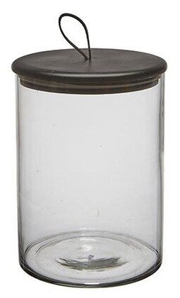 Locket på burken, tydligt och funktionellt, har en mörk nyans som kompletterar glaskroppens klara genomskinlighet. Det är utformat i svart med en slät, matt yta, vilket ger en stark kontrast till glaset. En liten ögla, fäst vid lockets mitt, tillåter enkel avlyftning och ger en praktisk hantering. Öglan är subtil men distinkt, tillverkad av ett material som ger ett robust intryck.
