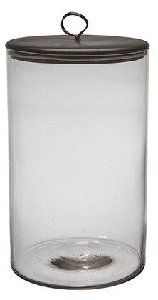Burken har ett svart lock som harmoniserar med glasets klara yta. Locket är skiftande i en mörkare ton som framhäver kontrasten mellan glaset och metallen. Det vilar stadigt på öppningen och avslutas med en cirkelformad knopp på toppen. Denna knopp är både dekorativ och praktisk, vilket gör det enkelt att lyfta av locket. Den mörka färgen tillför en distinkt karaktär till burkens helhetsintryck.