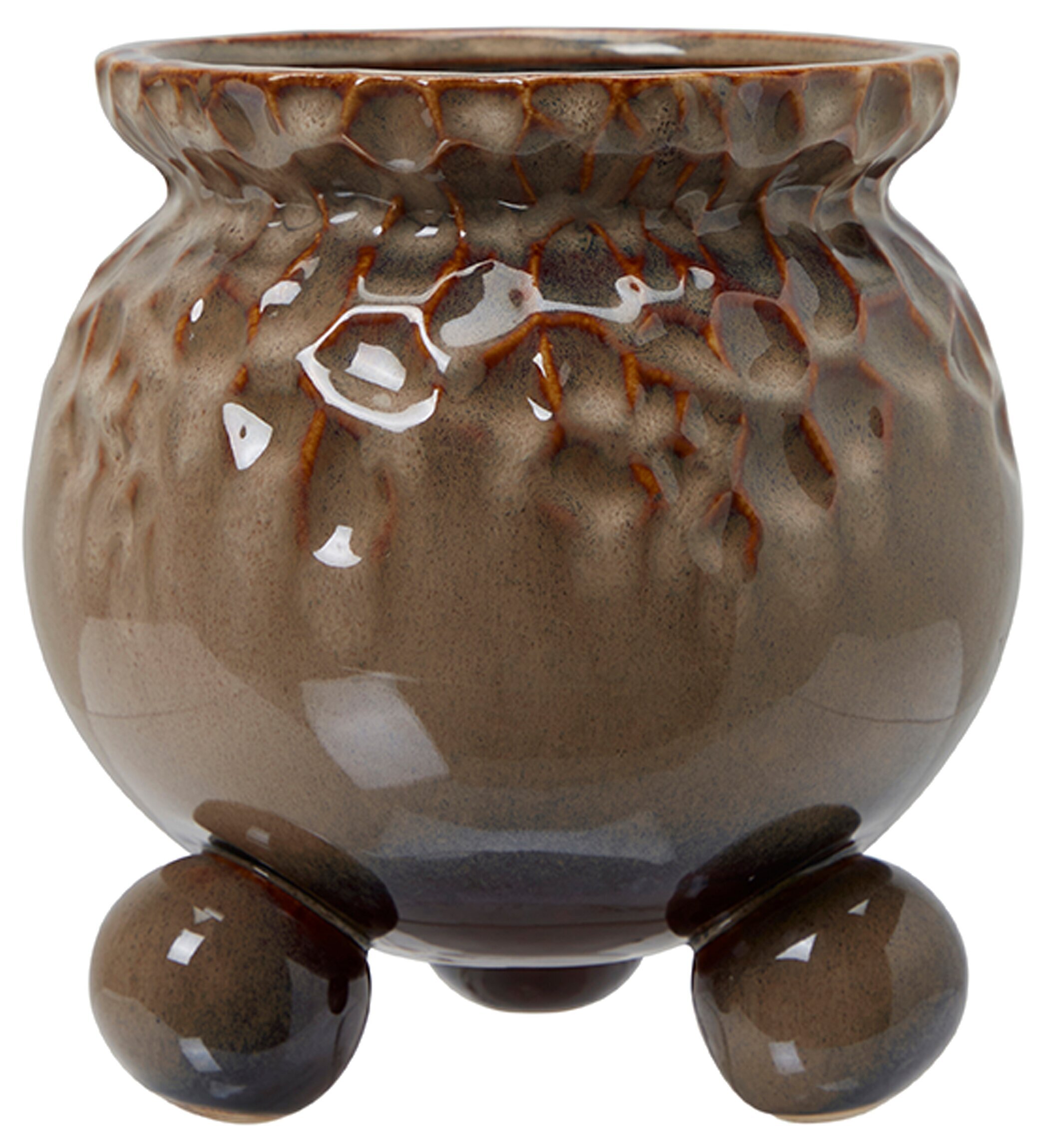 Vacker kruka med kulfötter i en fin brunmelerad nyans, fin till julens blomsterarrangemang. Det kan förekomma håligheter samt färgskillnader i lackeringen av krukan.