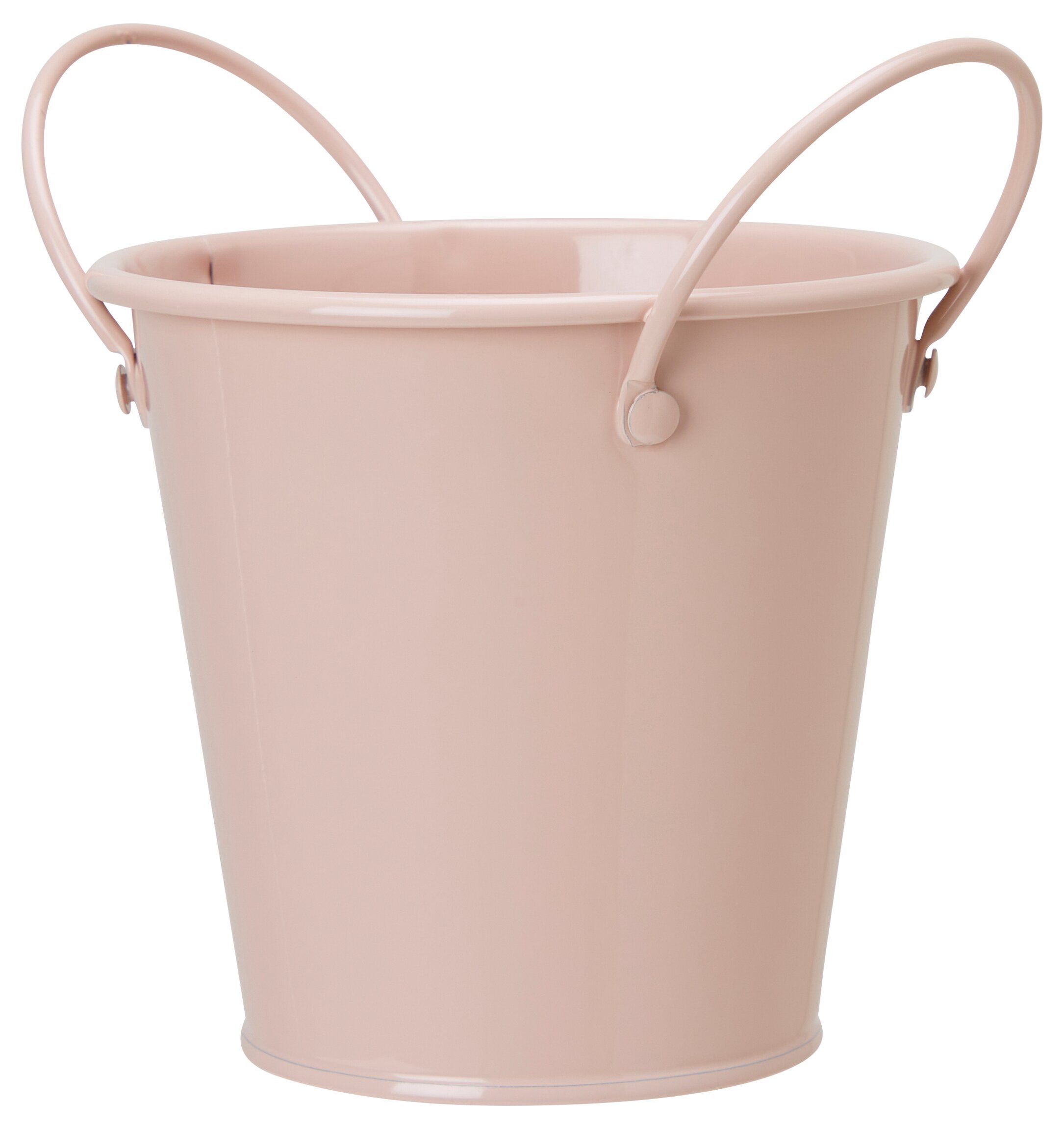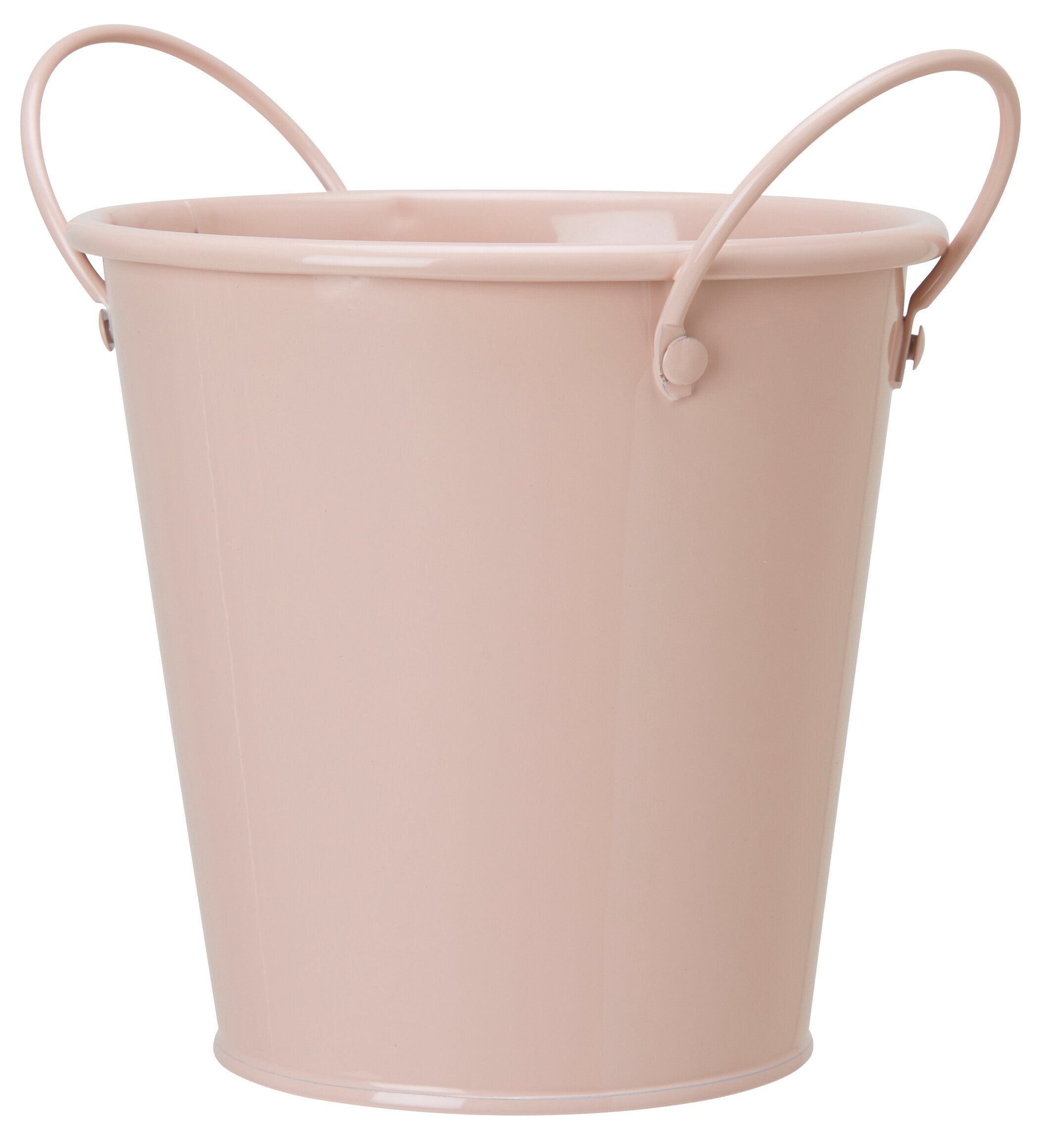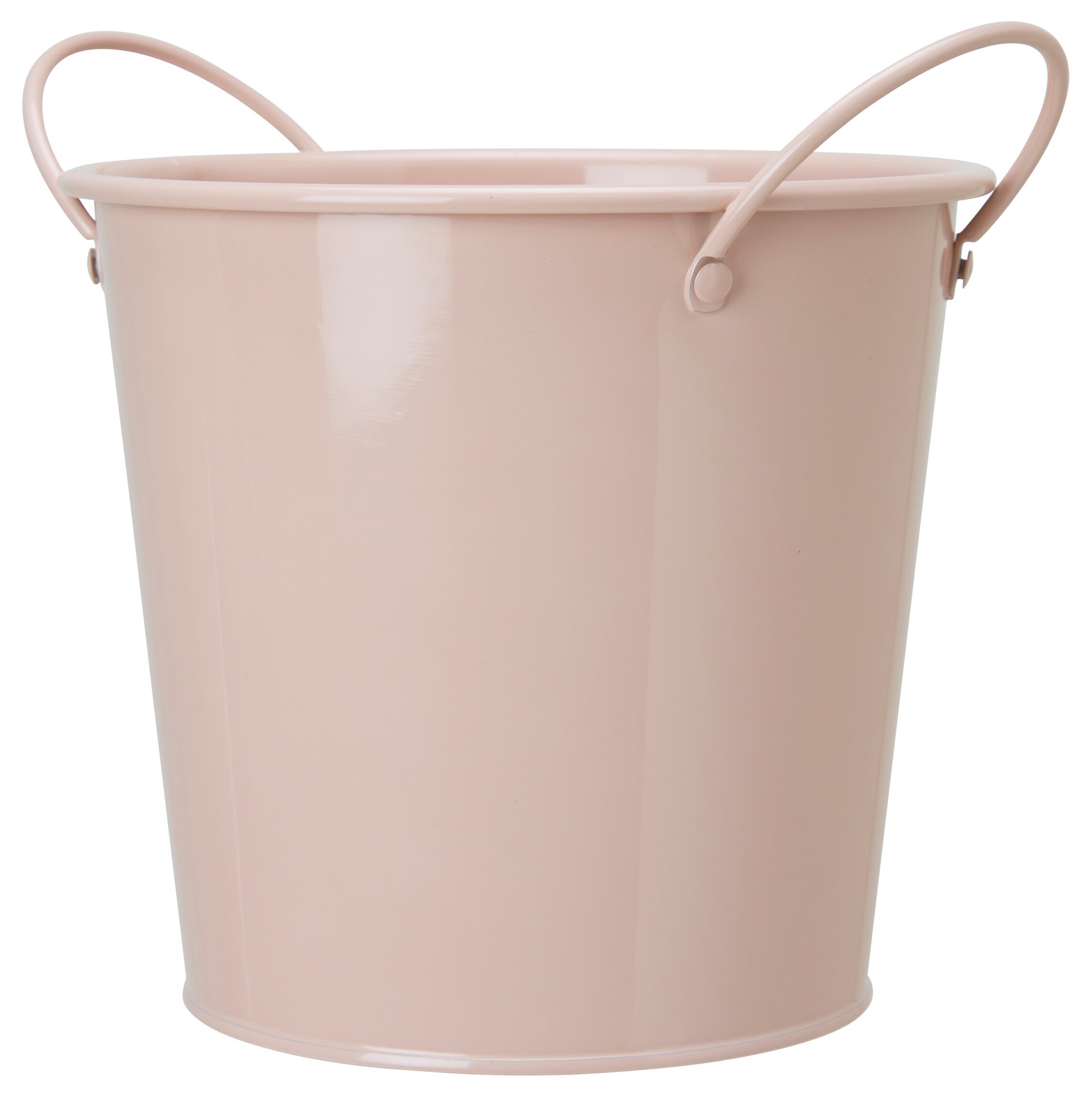 Tillverkade i lätt metall med mjuk rosa nyans och praktiska handtag. Varje kruka säljs separat och levereras med innerplast, vilket gör dem perfekta även för levande växter.