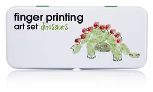 Designen på locket är enkel men effektiv, centrerad mot vänster sida ser vi texten "finger printing art set dinosaurs". Texten är tryckt i olika storlekar och stilar för att fånga ögat och ge en dynamisk känsla. Bredvid texten visas en bild av en dinosaurie. Denna illustration är gjord med fingeravtrycksteknik, vilket ger en unik och lekfull touch. Dinosaurien är i gröna toner med röda detaljer, som påminner om stegosaurusens karaktäristiska ryggplattor.