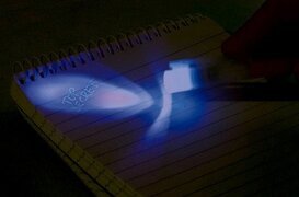 Pennan själv är delvis synlig, hålls i handen av en person vars fingrar kan urskiljas i bakgrunden. Detta ger en känsla av interaktivitet, där användaren direkt kan påverka vad som syns på papperet med hjälp av spionpennan från Worldwide co. Det verkar som att det skrivs eller belyses något hemligt eller dolt på papperet, vilket förstärks av pennans ljus.