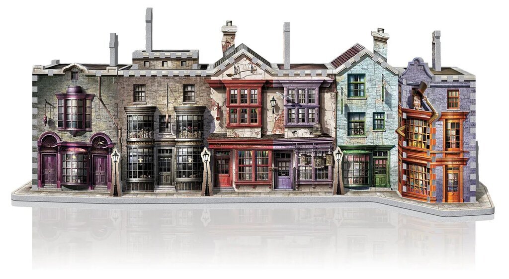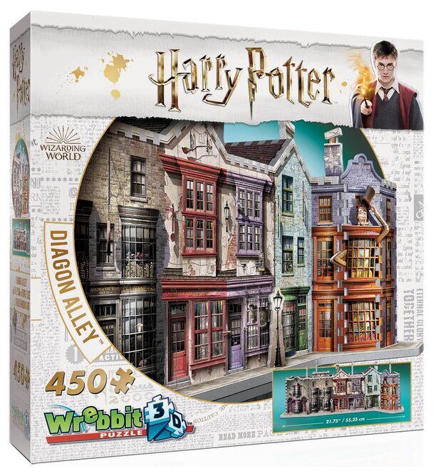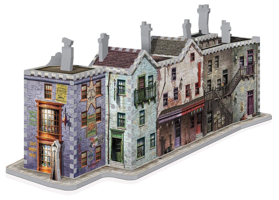 3D-pussel med Diagongränden, 450 mjuka tunna kartongbitar med baksida av skumplast. Illustrerade instruktioner på ett flertal språk bl a sv, fi, no, da, en, fr, es, nl, de, it, pl. Ålder 14+.