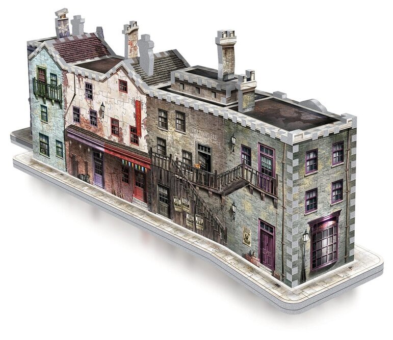 Bilden visar ett detaljerat 3D-pussel som avbildar en rad byggnader med en autentisk och gammaldags stil. Pusslet, inspirerat av Diagon Alley, är skapat av varumärket Wrebbit och presenteras av Köpstaden.se, en butik känd för sitt breda utbud av varierade produkter.