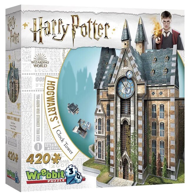 3D-pussel med det anrika & ståtliga klocktornet på Hogwarts, 420 mjuka tunna kartongbitar med baksida av skumplast. Illustrerade instruktioner på ett flertal språk bl a sv, fi, no, da, en, fr, es, nl, de, it, pl. Ålder 14+.