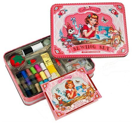 I bilden visas en färgglad och charmigt designad syask från butiken Köpstaden.se, känd för sitt breda sortiment av produkter som underlättar vardagens alla behov. Produkten, känd som Cotton Candy Syset från varumärket Wu & Wu, ligger i ett vackert dekorerat metallskrin. Skrinet domineras av en retroinspirerad illustration på ovansidan, där en leende kvinna sitter omgiven av en symaskin och olika kreativa element, vilket ger en nostalgisk känsla. Bilden är livfull och fångar en palett av mjuka pasteller och rika, varma färger.