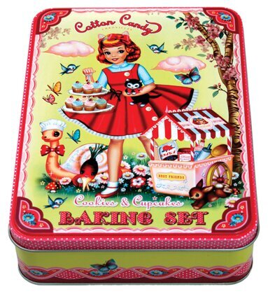 Dekorativ plåtburk innehållande allt som behövs till bakningen. Innehåller träslev, kavel, muffinsformar, kakformar, receptkort, ljus med ljushållare och kristyrset. Fin att ge bort som present. Storlek: 16x21x4,5 cm.