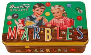 Plåtburk som innehåller ca 160 stycken kulor. Håll traditionen vid liv och lär barnen kasta kula.