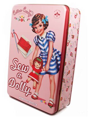 Denna plåtask innehåller allt som behövs för att sy en fin klänning till den medföljande dockan. I asken finns det instruktioner på hur man går till väga med knappar, blommor, dekorationer & skärp. Mått: 14 x 20,5 x 6 cm.