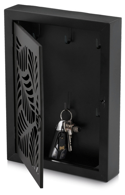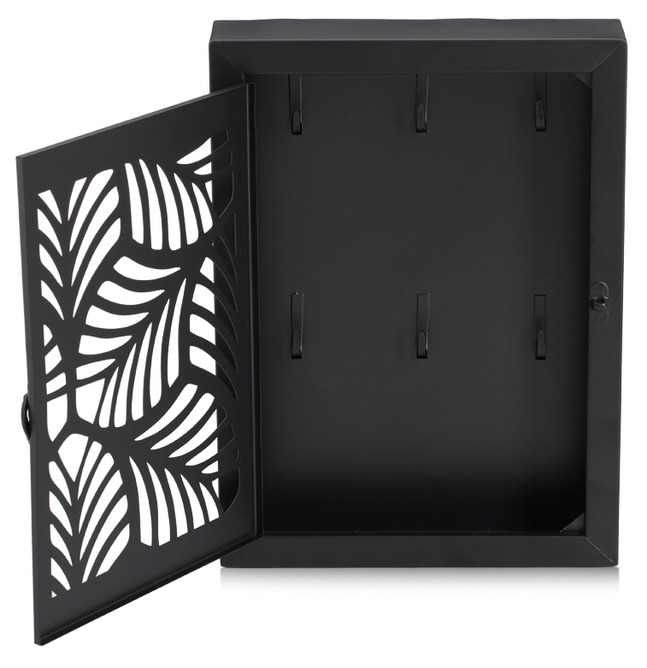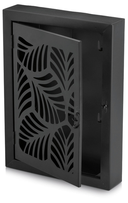 Nyckelskåp i svart metall som kombinerar praktisk förvaring med en dekorativ front i elegant blad-mönster. Inuti finns 6 krokar, perfekt för familjens nycklar, extranycklar eller bilnycklar.