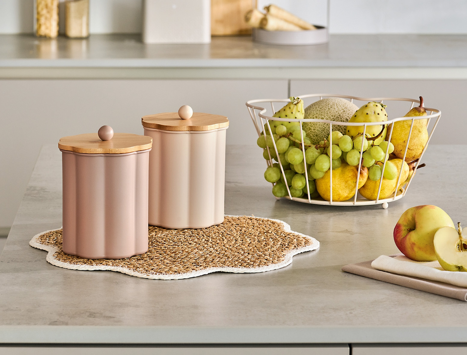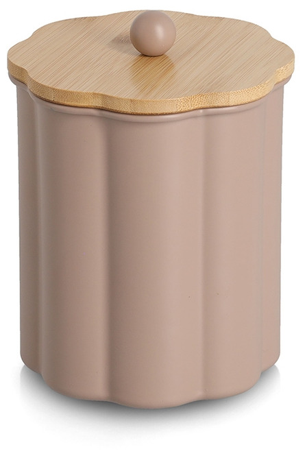 Burken är tillverkad i metall i en varm mocha ton och har ett dekorativt lock i naturlig bambu med rund knopp som handtag. Den integrerade silikonringen gör att locket sluter tätt och mjukt.